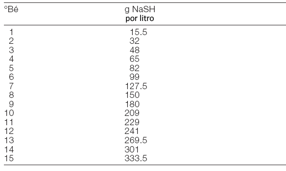 Densidad en ° Bé y la concentración de hidrosulfuro de sodio