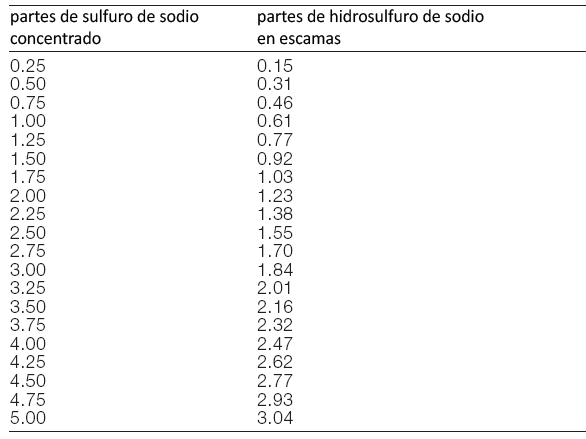 Tabla comparativa de relación de fuerzas de concentrado de sulfuro de sodio y de hidrosulfuro de sodio.