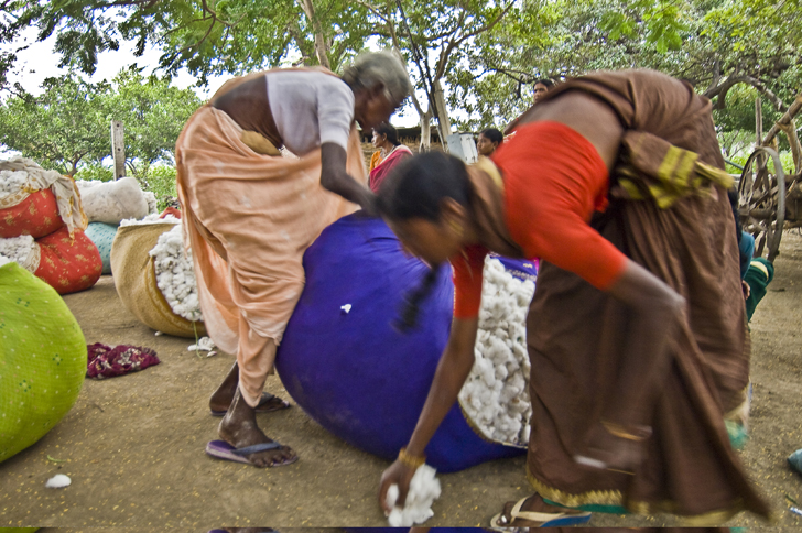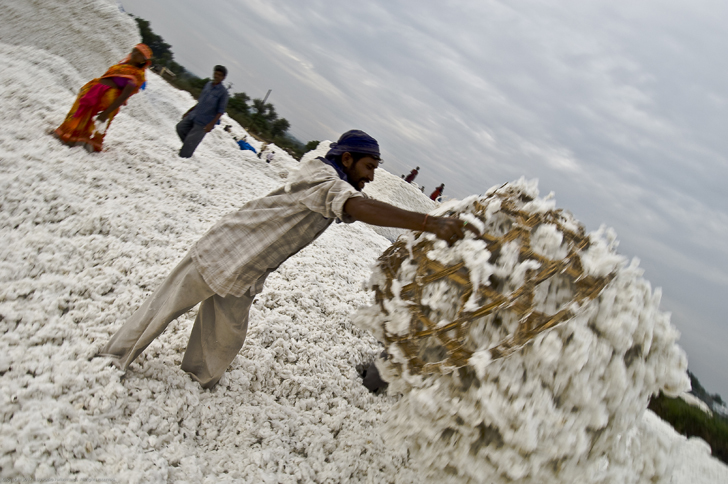 Los trabajadores transportan el algodón en grandes canastas para depositarlo en grandes pilas de fibra, clasificadas según calidades. El gran mercado local trabaja 19 horas diarias y un obrero cobra unos 2,50 € al día. (Vidarbha, India, 2007). |
