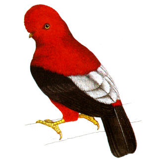 ocultándolo casi del todo. El plumaje en su mayoría rojo intenso. Alas