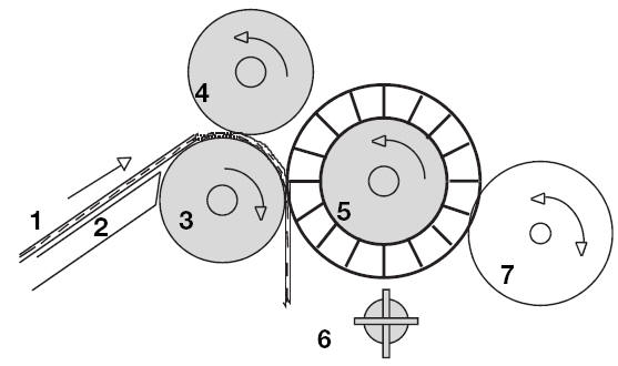 1. entrada de cuero para ser rasurado. 2. tablero para extender la piel. 3. rodillo de presión. 4. rodillo de transporte. 5. rodillo de rasurado. 6. cuchillas repelentes. 7. esmeril para afilar las cuchillas. |