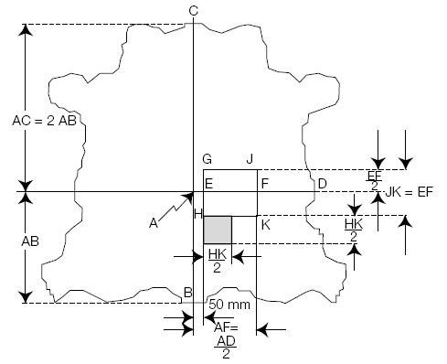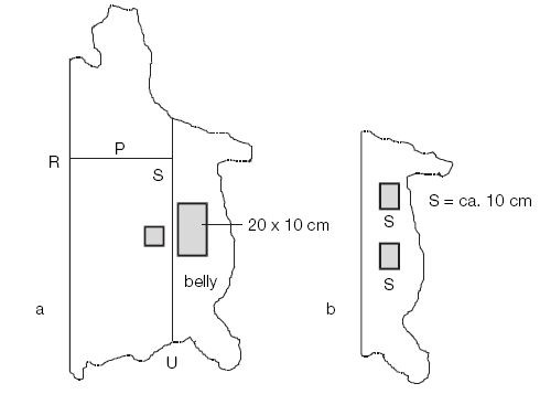 Sabido que realizaremos las pieles dos tipos de pruebas, una físicas y otras químicas, es necesario tomar las muestras adecuadas para cada prueba. Una vez seleccionada la muestra de piel para el análisis químico, ésta se pasa a través de un cortador de molino, que convierte en polvo el material que ha de ser testado; el cuero pulverizado se llama "polvo de cuero". Adecuado para este fin son todos los tipos de molinos equipado con una pantalla de 4 mm y que funciona a una velocidad de entre 700 y 1000 r.p.m. En los gráficos a continuación, las áreas en gris son muestras para análisis químicos; las áreas remarcadas en blanco, para muestras de análisis físicos. Las cantidades que damos son aproximadas (ca). |