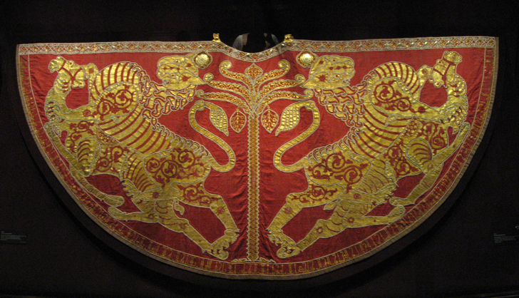 Manto de coronación de Roger II de Sicilia. Seda tintada en rojo carmesí de la grana quermes. Bordado con hilo de oro y perlas naturales. Royal Workshop, Palermo, Sicilia, 1133 - 34. Kunsthistorisches Museum, Viena. |