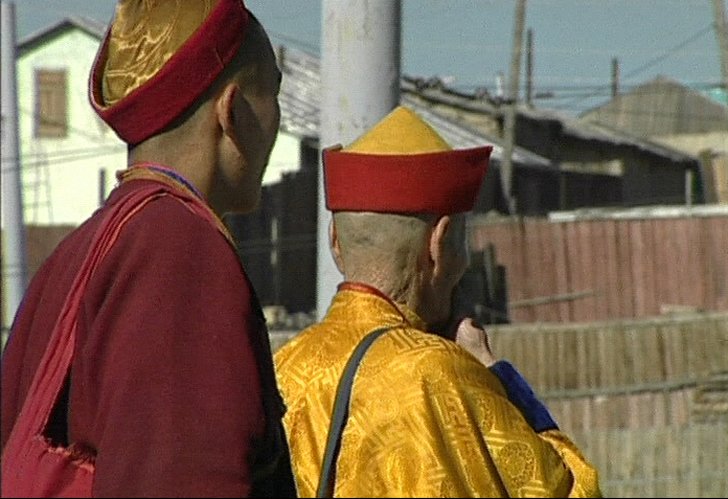 | Monjes budistas (del llamado budismo amarillo, tibetano) en una calle de Ulan Bator, vistiendo con su tradicional hábito de color amarillo, obtenido con colorante yellow kha. Mongolia, 2001. Foto EDYM. | |||||||||||||||||||||||||||||||